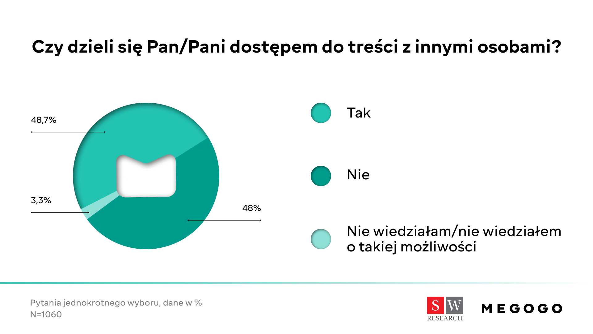 Na pytanie: „Czy dzieli się Pan/Pani dostępem do treści VOD z innymi osobami?” blisko co drugi ankietowany (48,7 proc.) odpowiedział, że dzieli się. Nie robi tego 48 proc., a 3,3 proc. badanych nie wiedziało o takiej możliwości.