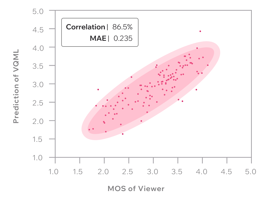 Wyniki weryfikacji VQML przy użyciu referencyjnej bazy danych KoNViD-1k potwierdzają 86,5% korelację pomiędzy rzeczywistym MOS a jego wartością określoną przez VQML. Średni błąd bezwzględny (MAE) wynosi 0,235, czyli mniej niż w przypadku wielu obecnie dostępnych na rynku produktów tego typu. Jako oryginalne i przełomowe podejście do pomiaru jakości obrazu, VQML zyskuje wystarczającą konkurencyjność na rynku i umacnia swoją pozycję.