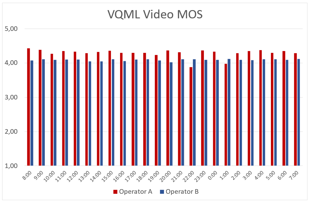 Jak wynika z zaobserwowanych danych, dzięki pracy sieci komórkowej w architekturze NSA (Non-Standalone) i jednoczesnym wsparciu dla technologii LTE (4G) oraz New Radio (5G) na obecnym etapie nasycenia sieci, przynajmniej w dużych miastach nie występują deficyty pojemności sieci. To bezpośrednio przekłada się na zmierzone wartości jakości połączeń wideo kształtujących się w zakresie od 3,88 do 4,43 dla obu operatorów. Dla operatora A średnia wartość dla wszystkich pomiarów w ciągu doby wynosi 4:29, natomiast średnia wartość dla operatora B to 4,08. Obu operatorów dzieli więc 0,2 w skali MOS. Wartość różni się zatem w niewielkim stopniu, w obu przypadkach mieści się w przedziale MOS ocenianym jako dobry, ale jest zauważalna jako stała. Może to wynikać z różnych kodeków stosowanych w obu sieciach, ale nasze obserwacje wskazują również na różną rozdzielczość wideo żądaną z kamery na poczet transmisji. W przypadku wideo dla operatora A żądana rozdzielczość to 1280x720 pikseli, natomiast w przypadku operatora B to 640x480 pikseli. Na wyniki nie miała wpływu pora obserwacji, a więc fakt, czy pomiar realizujemy w godzinie największego ruchu, czy poza nią. Podczas testu VQML MOS dla operatora A dwukrotnie wystąpiła istotna utrata pakietów (packet loss rate = 9%), która spowodowała obniżenie jakości strumienia wideo (pomiary były nagrywane i logowane, co umożliwiło późniejszą analizę). Algorytm VQML prawidłowo wykrył spadek jakości otrzymanego wideo oraz wskazał niższe wyniki MOS: 3.88 i 3.98.