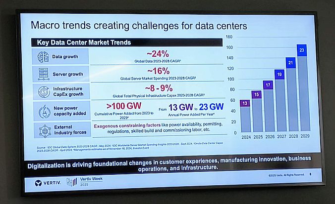 Gio Albertazzi, CEO Vertiv podczas konferencji powiedział, że obserwujemy stałe przyspieszenie w budowie prefabrykowanych, modularnych centrów danych, które pozwalają spełniać wymagania najnowszej generacji układów scalonych, technologii i usług. Podkreślił, że dynamiczny rozwój ekosystemu AI wzmacnia pozycję Vertiv, jako dostawcy infrastruktury dla centrów danych dedykowanej AI. Według CEO Vertiv, branża będzie rozwijać się na dwóch płaszczyznach: tradycyjnej, która nadal będzie istotna, oraz drugiej, która przyspieszy dzięki prefabrykowanym, pełnowymiarowym rozwiązaniom gigawatowym.