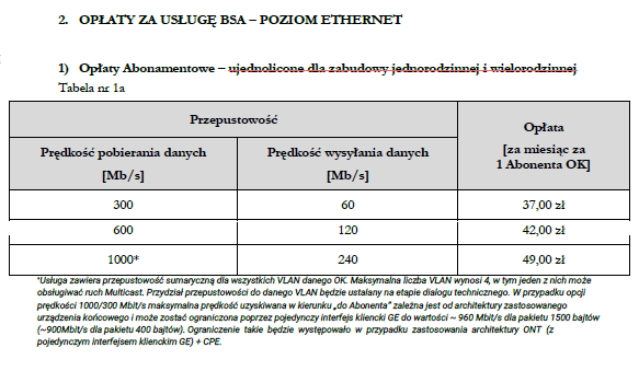 Jednorazowa opłata za aktywację usługi BSA w technologii FTTH to 199 zł netto, a za dezaktywację 425 zł. Zmiana opcji usługi BSA wiąże się z opłatą jednorazową 25 zł.
