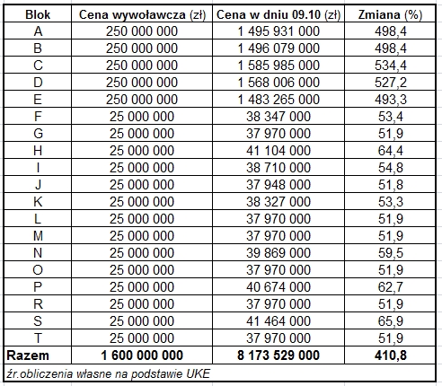 Łącznie po dzisiejszym dniu całość licytowanych zasobów radiowych kosztuje 8,173 mld zł, a będą jeszcze droższe po rundzie przetargowej. W aukcji padnie zatem historyczny rekord dla polskiej telekomunikacji i postępowań częstotliwościowym. Zaoferowana kwota będzie wyższa, niż wartość przydziału licencji UMTS w 2000 r. Oczywiście, jeżeli po zakończeniu postępowania cała sprawa zostanie sfinalizowana od strony formalnej, co nie jest zupełnie pewne.