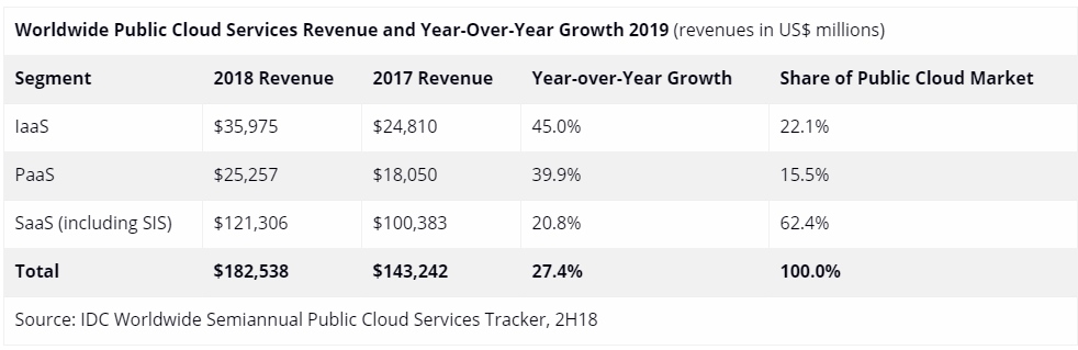 Światowy rynek usług w chmurze publicznej w 2018 r. wzrósł o 27,4 proc. rok do roku, osiągając wartość prawie 183 mld dolarów, wynika z szacunków International Data Corporation (IDC) zamieszczonych w raporcie „World International Semiannual Public Cloud Services Tracker”. To tempo wzrostu, które jest ponad 4,5 razy większe niż średnia w branży IT, wykazało niewielki spadek w stosunku do 2017 r., co w ocenie analityków IDC nie jest niespodzianką, biorąc pod uwagę rosnącą bazę porównawczą na rynku usług w chmurze publicznej, która wzrosła ponad dwukrotnie w ciągu ostatnich 3 lat.