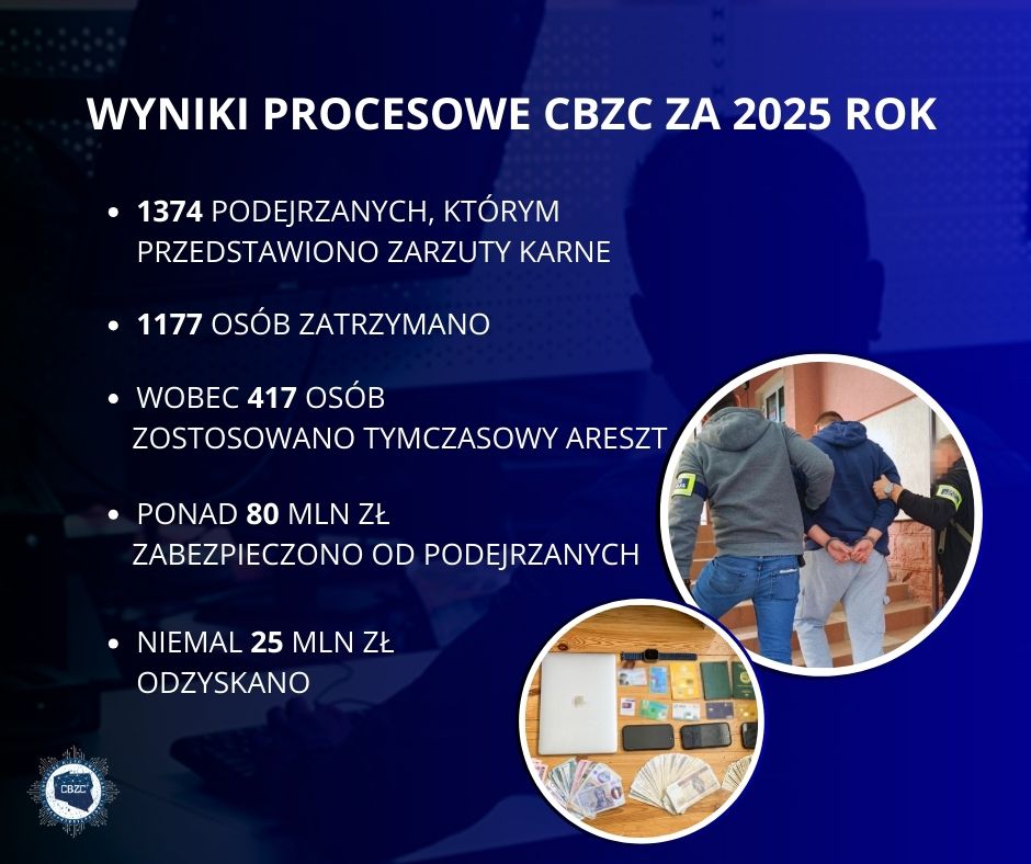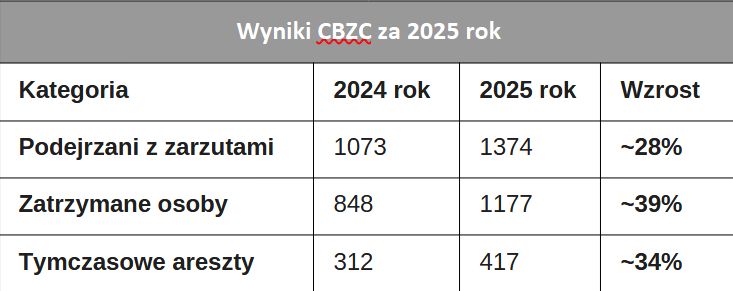 W 2025 roku CBZC, liczące obecnie niemal 1100 funkcjonariuszy, zanotowało znaczący progres w efektywności procesowej (por. tabelka). Biuro zabezpieczyło mienie podejrzanych o wartości ponad 80 mln zł oraz odzyskało niemal 25 mln zł.