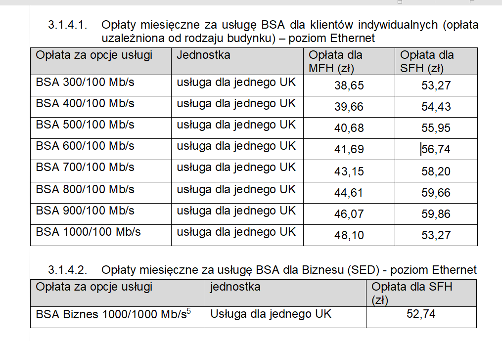 Jeśli chodzi o usługi BSA, to operator zdecydował się je zmodyfikować. Wówczas proponował aż 10 jej wariantów, obecnie ograniczył ją do ośmiu rezygnując z przepływności 1500/500 Mb/s i 2500/500 Mb/s. Podniósł też stawki w ofercie. W ubiegłym roku ceny dla zabudowy wielorodzinnej zaczynały się od 32,52 zł miesięcznie za usługę BSA 300/100 Mb/s, a teraz stawka wzrosła do 38,65 zł.