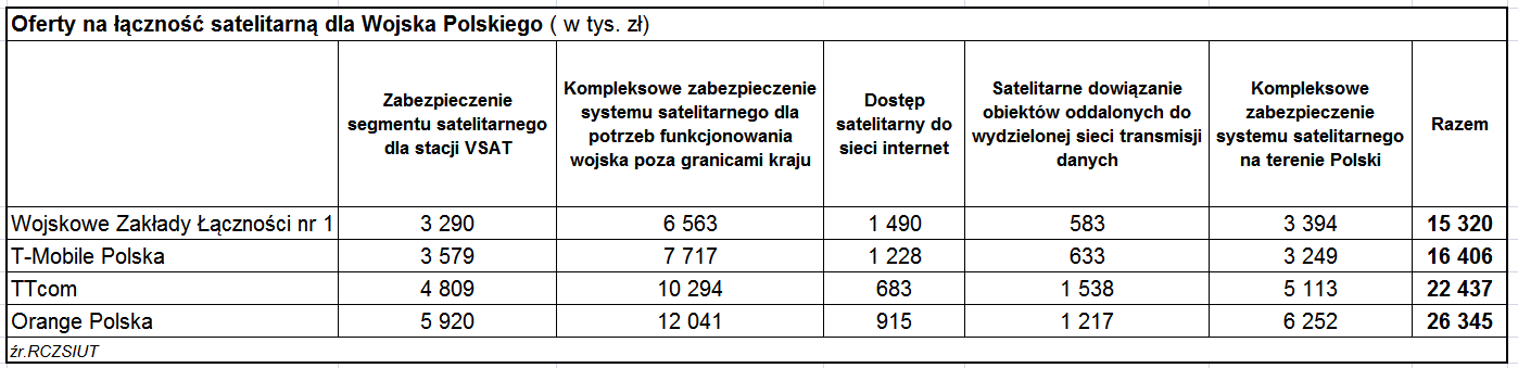 Najdroższe była natomiast oferta Orange o wartości 26,3 mln zł. W toku postępowania na umowę ramową operator nie złożył najtańszej oferty w żadnym z pięciu zadań. WZŁ nr 1 udało się to trzy razy w przypadku: dzierżawy przepływności satelitarnej w sieciach Eutelsat i Intelsat, dostawy oraz integracji sprzętu i usług poza granicami kraju i dowiązaniu satelitarnego systemu do naziemnych sieci transmisji danych. TTcom złożył najlepszą ofertę na usługi satelitarnego dostępu do internetu, a T-Mobile Polska na integrację sprzętu i usług na terenie Polski.