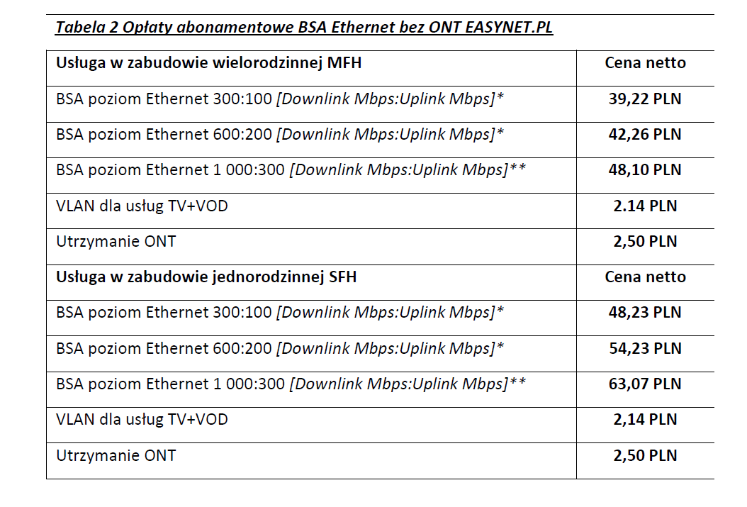 W przypadku usługi BSA operator ma w swej ofercie 3 przepływności. Opłaty różnicuje w zależności od tego, czy usługa jest oferowana w zabudowie jednorodzinnej czy wielorodzinnej.