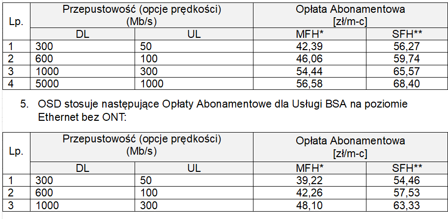 W przypadku usługi BSA FCA ma w swej ofercie trzy przepływności, które różnicuje w zależności od tego, czy jest ona oferowana w zabudowie jednorodzinnej (SFH) czy wielorodzinnej (MFH).