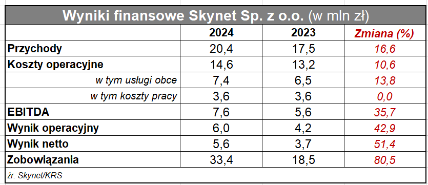 W 2024 r. Skynet miał 20,4 mln zł przychodów, 6 mln zł zysku operacyjnego i blisko tyle samo zysku netto.