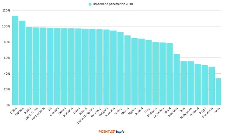 W latach 2025–2030 Point Topic prognozuje 16-proc. wzrost łącznej liczby abonentów stacjonarnego internetu szerokopasmowego na 30 największych rynkach. Większość nowych użytkowników netto będzie pochodzić z FTTP, ale wzrost w segmencie FWA (5G) będzie znacznie silniejszy w ujęciu procentowym. Spodziewany jest wzrost liczby linii FTTP o około 23 proc. (+231 mln), podczas gdy liczba linii FWA wzrośnie ponad dwukrotnie (z 32 mln do 83 mln).