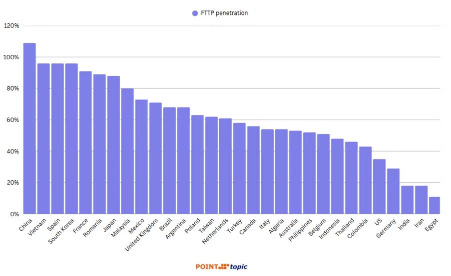 Na polskim rynku światłowód także radzi sobie coraz lepiej. Według danych Point Topic, w 2023 r. około 74,5 proc. gospodarstw domowych w Polsce miało dostęp do FTTP, co oznacza istotny wzrost pokrycia światłowodem.