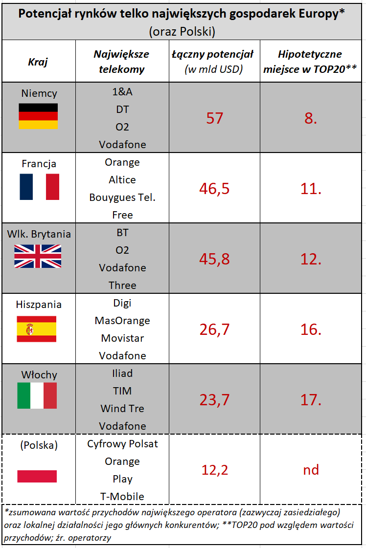 Samodzielnie żaden z krajowych rynków Europy nie daje szans na globalne TOP20 pod względem liczby abonentów. Inaczej jest jeżeli chodzi o parametry finansowe: łączny przychód czterech największych niemieckich telekomów wynosił w 2024 r. ok. 57 mld USD i telekom o takich obrotach zająłby 8. miejsce na świecie pomiędzy China Telecom a Charter Comm.