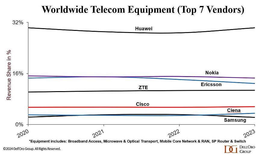Analiza Dell'Oro sześciu programów telekomunikacyjnych pokazuje, że ogólny udział Huawei w przychodach ze sprzętu telekomunikacyjnego wyniósł 30 proc. w 2023 r., bez zmian w stosunku do 2020 r. Wynika to częściowo z faktu, że Huawei pozostaje dostawcą nr 1 w pięciu z sześciu monitorowanych przez Dell’Oro segmentach telekomunikacyjnych, a chiński dostawca nadal dominuje na rynku poza Ameryką Północną.