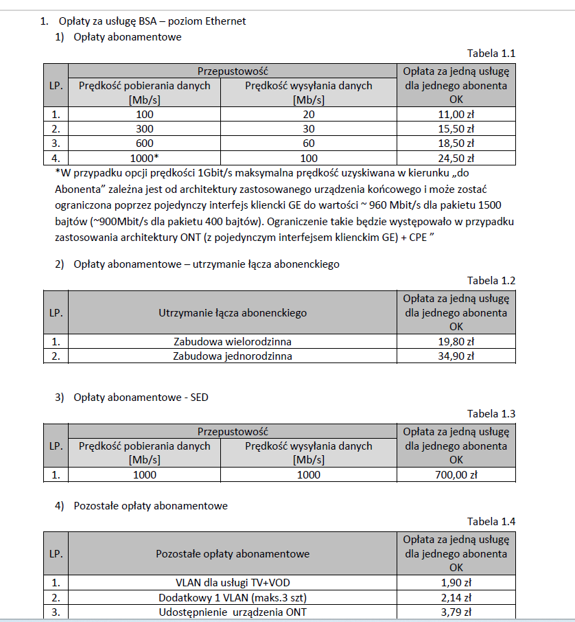 W przypadku usługi BSA operator ma w swej ofercie 4 przepływności. Do tego dolicza opłatę za utrzymanie łącza abonenckiego, które różnicuje zależności od tego, czy usługa jest oferowana w zabudowie jednorodzinnej czy wielorodzinnej.