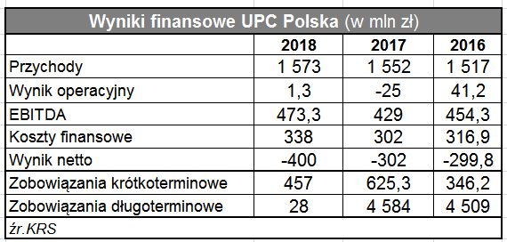 Ze sprawozdania złożonego przez operatora w KRS wynika, że 2018 r. UPC zanotowało 479 mln dodatniego wyniku EBITDA (o 10,3 proc. więcej niż e 2017 r.) i 1,3 mln zł zysku operacyjnego. Jak od wielu lat spółka zanotowała potężną stratę netto – 400 mln zł – co wynikało z ciążącego jej zadłużenia z tytułu wewnętrznych pożyczek w grupie Liberty Global.