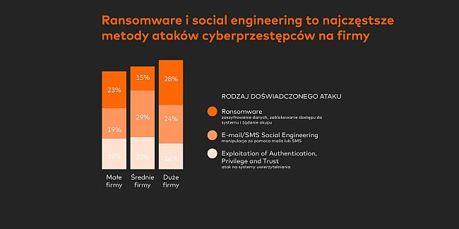 Najczęściej atakowane są firmy z branży produkcyjnej (49 proc.), handlowej (38 proc.) i e-commerce (34 proc.). Dominują ataki ransomware, socjotechniczne (e-mail, SMS) oraz próby naruszenia systemów uwierzytelniania.