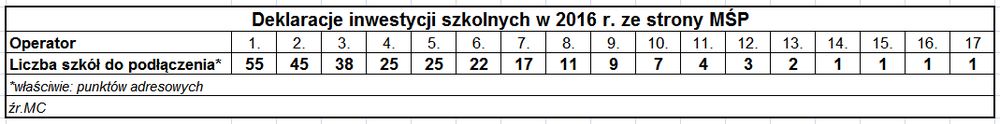 Mniejsi operatorzy zadeklarowali łącznie 267 punktów adresowych do pokrycia siecią w latach 2016-2019. Część deklaracji już została zrealizowana. Mali operatorzy obiecują podłączanie po kilkadziesiąt placówek edukacyjnych rocznie.