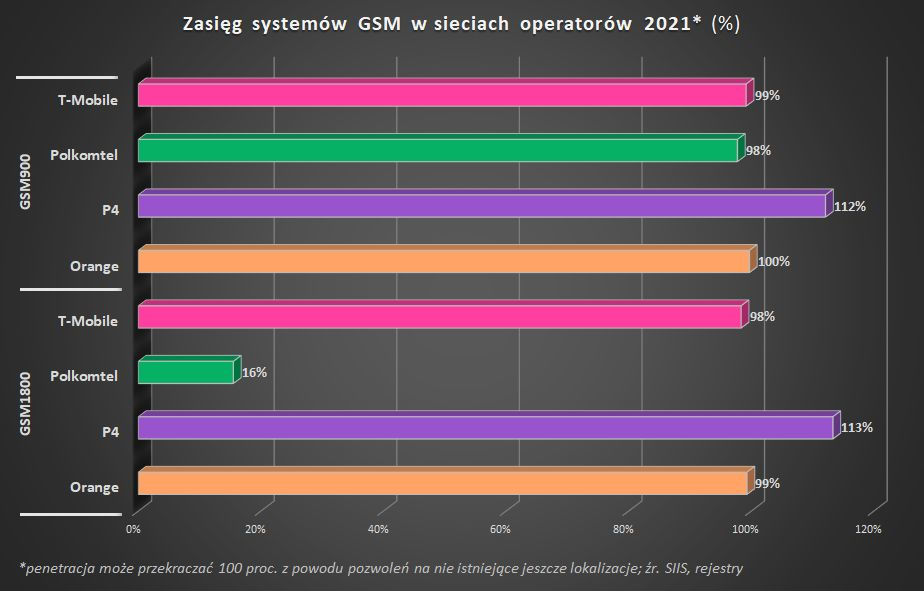 Jeżeli chodzi o technologię GSM900, to do końca 2021 r. wszyscy operatorzy wdrożyli ją w pełnym zasięgu swoich sieci. Orange, Play i T-Mobile mieli ją również w pełnym zasięgu na częstotliwości 1800 MHz. Odsetek pozwoleń były wyższy dla Playa i przekraczał 100 proc. co wynikało z trwającej rozbudowy sieci tego operatora (a więc przewagi liczby pozwoleń nad liczbą działających stacji). Potwierdza to jednak, że i Play chce mieć GSM900/1800 w całym zasięgu sieci. Inaczej w przypadku Polkomtela, który postanowił pomieścić w paśmie 900 MHz zarówno GSM, jak UMTS i LTE, a 1800 MHz przeznaczyć głównie na LTE.