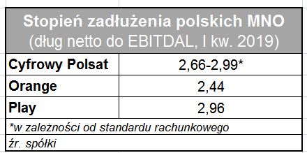 Stosunek długu netto do wskaźnika EBITDAL (którym teraz zaczynają się posługiwać telekomy stosownie do nowych standardów finansowych) w przypadku Grupy CP, Orange Polska i Playa mieści się na podobnym poziomie – między 2x a 3x.
