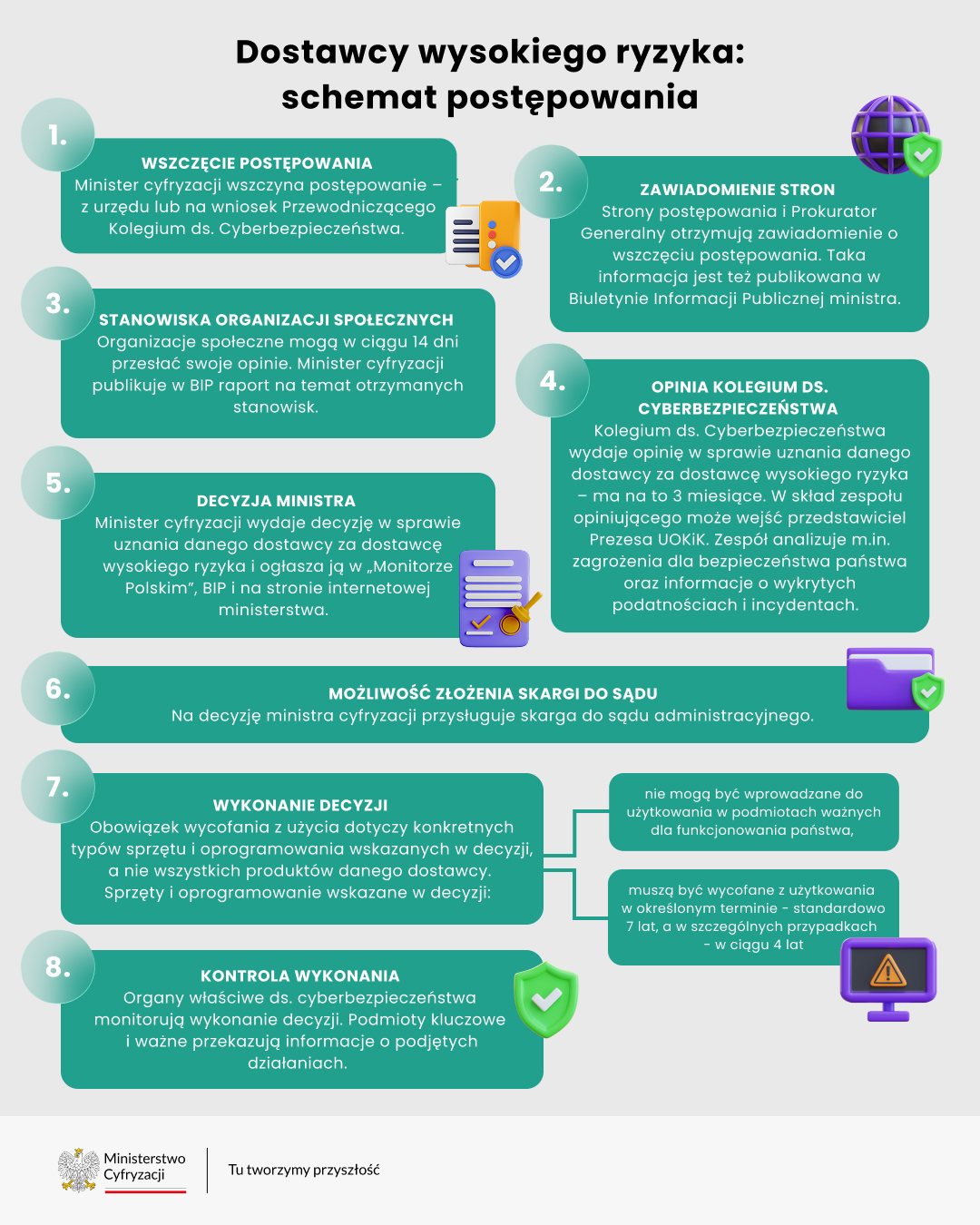 Minister cyfryzacji rozpatrzy sprawę na podstawie obiektywnych przesłanek, w tym technicznych, takich jak wykryte incydenty czy podatności sprzętu. Jeśli uzna, że dostawca stanowi zagrożenie, wskaże w decyzji konkretne typy produktów lub usługi ICT, które są niebezpieczne. Jeśli w trakcie postępowania okaże się, że dostawca nie stanowi zagrożenia, minister zakończy sprawę bez wydawania takiej decyzji.