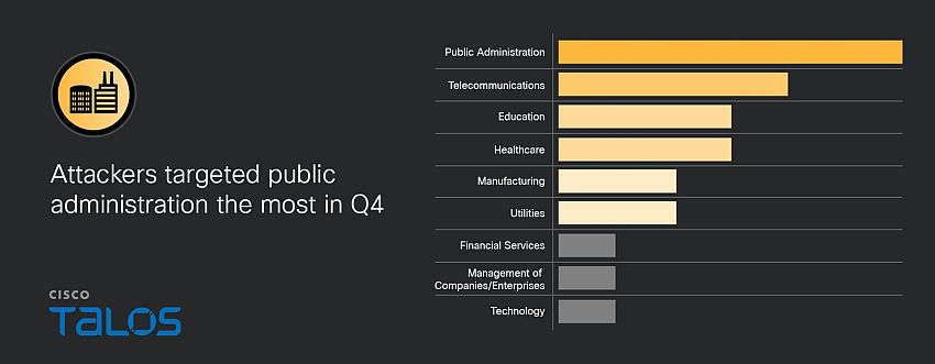 Najczęściej atakowanym sektorem ponownie była administracja publiczna. Zdaniem analityków wpływają na to ograniczone budżety, starsza infrastruktura IT oraz niska tolerancja na przestoje, co zwiększa podatność na presję finansową ze strony atakujących. Drugim najczęściej atakowanym sektorem w ostatnim kwartale 2025 r. była telekomunikacja.