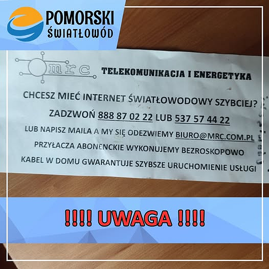 – Docierają do nas sygnały od państwa dotyczące oferty firmy MRC, która proponuje wykonanie przyłącza telekomunikacyjnego bezpośrednio do Państwa domu. Informujemy, że działania te są prowadzone bez naszej wiedzy i zgody – informuje Pomorski Światłowód.