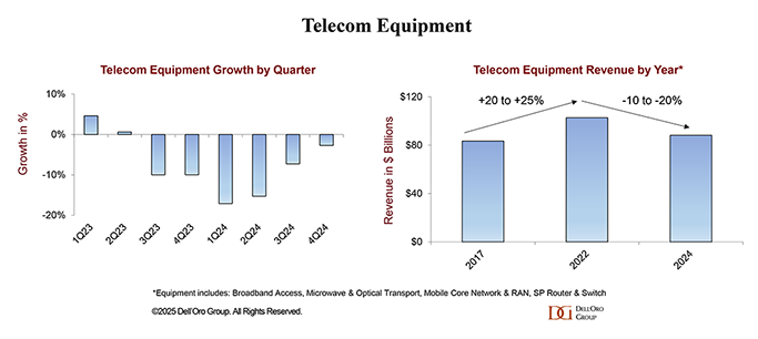Prognozy na 2025 r. wskazują na stabilizację warunków rynkowych, choć ten rok nadal będzie wymagający. Analitycy Dell’Oro przewidują, że globalne przychody ze sprzedaży sprzętu telekomunikacyjnego pozostaną na niezmienionym poziomie względem 2024 r.