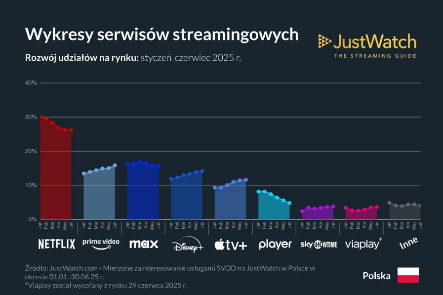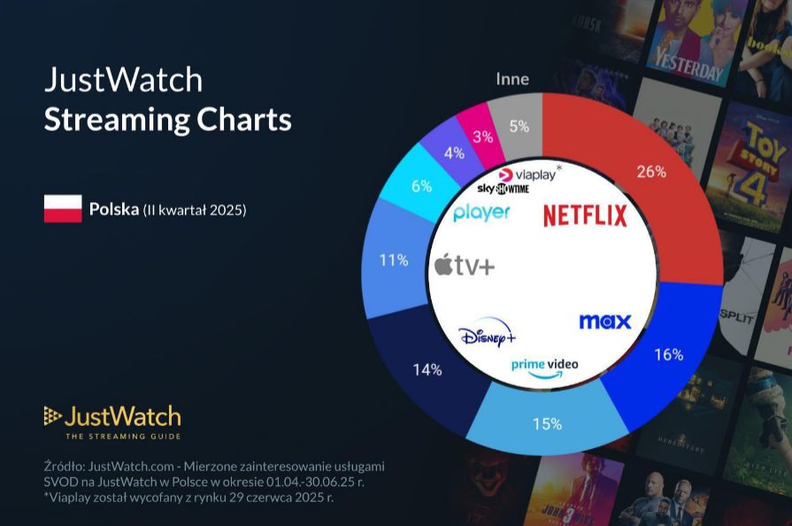- Viaplay , który w 2. kw. 2024 miał 8%, zakończył działalność w Polsce w czerwcu 2025 r.