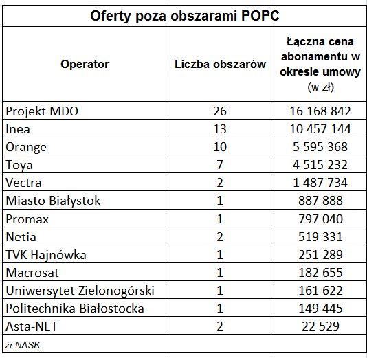 Zastanawiające jednak, że niemal równie niski poziom konkurencji jest o podłączenie placówek szkolnych poza obszarami POPC. Tych było w bieżącym postępowaniu NASK 66, a konkurencyjne oferty padły tylko na kilku z nich. Projekt MDO rywalizuje o obszar poznański z Ineą i Vectrą, a na kilku z samą Ineą, a o rejon zielonogórski z Uniwersytetem Zielonogórskim. Z Orange MDO natomiast konkuruje o obszar nr. 2 w (zielongórski i gorzowski), a o Elblag z Pasłękiem z MDO walczy Netia. Łącznie konsorcjum małych operatorów złożyło oferty na 26 obszarów na łączną sumę samych tylko opłat abonamentowych w okresie trwania umowy z NASK ponad 16 mln zł. O 13 obszarów ubiega się Inea (10,5 mln zł), o 10 Orange (5,6 mln zł), a o 7 Toya (4,5 mln zł).