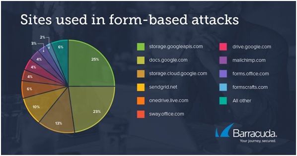 Wśród prawie 100 tys. ataków poprzez formularze wykrytych przez firmę Barracuda w okresie od 1 stycznia do 30 kwietnia br., w 65 proc. przypadków do oszustwa były wykorzystywane strony internetowe Google służące do przechowywania i udostępniania plików. Dotyczy to witryn takich jak storage.googleapis.com (25 proc.), docs.google.com (23 proc.), storage.cloud.google.com (13 proc.) czy drive.google.com (4 proc.).