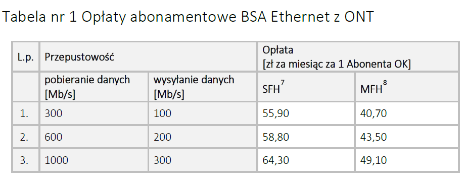 Jednorazowa opłata za aktywację usługi BSA w technologii FTTH to 206,83 zł netto, a za dezaktywację 59,90 zł. Zmiana opcji usługi BSA wiąże się z opłatą jednorazową 28,65 zł.