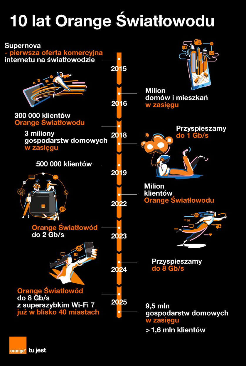 – Był on dostępny w 16 miastach w kraju, a najwyższa opcja prędkości wynosiła 600 Mb/s. Dziś Orange Światłowód rozpędził się do 8 Gb/s, ma już ponad 1,6 mln klientów, dociera do 9,5 mln domów, mieszkań i firm w kraju, a jak potwierdzają niezależne pomiary prędkości internetu, jest najszybszym światłowodem w Polsce – podkreśla Orange.