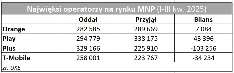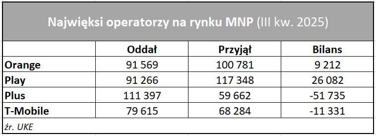 Na rynku MNP najlepszy bilans zanotował w minionym kwartale Play, który netto pozyskał 26 tys. numerów. Orange zdobył netto 9 tys. numerów, T-Mobile stracił 11 tys. a Polkomtel stracił 51 tys. Takie trendy utrzymują się od początku roku. Play zyskiwał także w I i II kw. tego roku, T-Mobile oraz Polkomtel w tym czasie traciły. Orange tracił na początku roku, by wyjść na plus w dwóch kolejnych kwartałach. Od początku roku Play pozyskał 43 tys. numerów, a Polkomtel oddał ponad 100 tys.