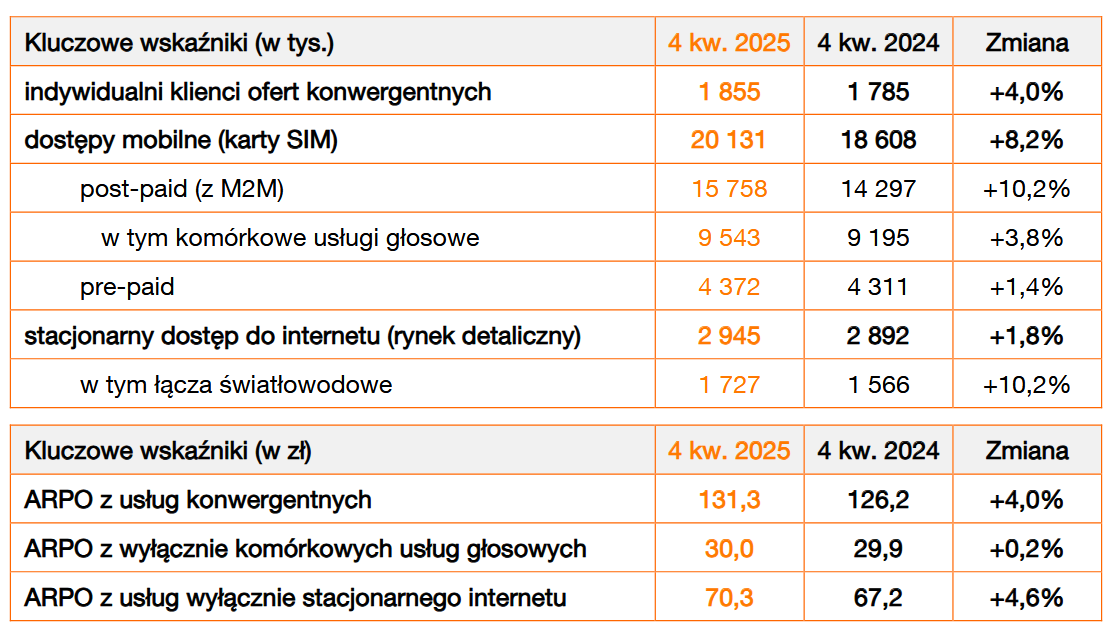 W IV kw. 2025 r. Orange zdobył 42 tys. klientów optycznego dostępu netto i 77 tys. klientów kontraktowych usług mobilnych. Baza pre-paid spadła o 10 tys. Przybyło 677 tys. kart sim M2M. Bożena Leśniewska, odpowiedzialna w zarządzie Orange za rynek B2B, mówiła, że to efekt inwestycji firm energetycznych w systemy zdalnego odczytu liczników. W IV kw. Orange podpisał umowę z Eneą na 600 tys. kart.