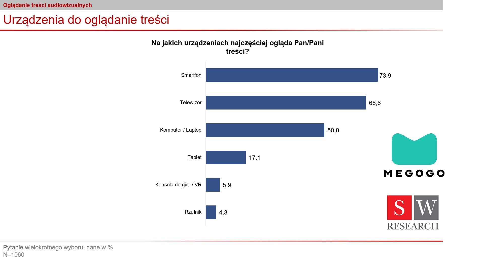 ‒ Zmiany w przyzwyczajeniach widzów mogą odzwierciedlać rosnące zapotrzebowanie na elastyczną, mobilną oraz wolną od reklam rozrywkę. Najpopularniejszymi urządzeniami, na których oglądamy treści wideo są smartfon (73,9 proc.) oraz telewizor (68,6 proc.). Ponadto do tego celu co drugi z ankietowanych wykorzystuje komputer lub laptop (17,1 proc.), konsolę do gier lub VR (5,9 proc.) oraz rzutnik (4,3 proc.) – informuje Artur Pacuła, CEO Megogo w Polsce.