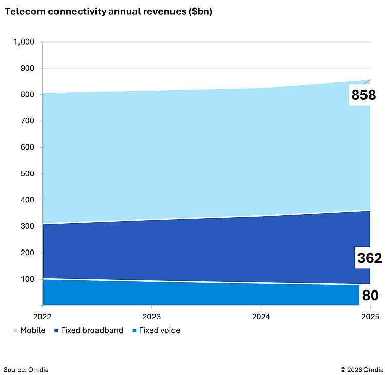 Globalny rynek usług łączności telekomunikacyjnej odnotował w 2025 r. umiarkowany wzrost, potwierdzając utrzymujące się wyzwania strukturalne sektora. Z danych zebranych przez Omdia wynika, że łączne przychody z usług mobilnych, szerokopasmowych i głosowych osiągnęły 1,3 bln dolarów, co oznacza wzrost o 4 proc. rok do roku. W samym IV kw. 2025 r. rynek był wart 333 mld dolarów (+5 proc. r/r).