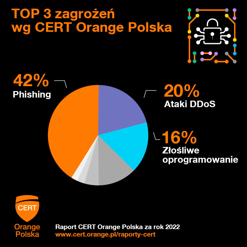 Według danych Raportu CERT Orange Polska za rok 2022, oszustwa polegające na wyłudzaniu danych, czyli głównie phishing, podobnie jak w ubiegłym roku, stanowiły ponad 40 proc. wszystkich z jakimi mierzył się zespół operatora dbający o bezpieczeństwo internautów. Wśród nich najwięcej było fałszywych ofert szybkiego zarobku ogromnych kwot poprzez różnego rodzaju inwestycje, m.in. w akcje znanych firm czy giełdy kryptowalut. Wyłudzaniu danych służyły także sensacyjne fake newsy, a pieniędzy – fałszywe sklepy i popularne również rok wcześniej tzw. oszustwo na kupującego.