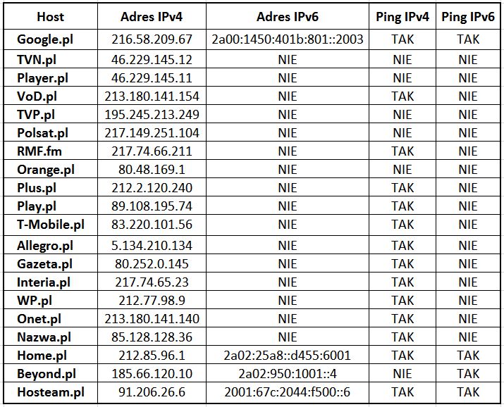 A jak to wygląda u nas? Jak pisałem wyżej – gros ruchu opiera się nadal na IPv4 i wszystko wskazuje, że długi czas tak będzie. Polscy content providerzy zdają się nie przejmować i swoich usług oraz treści w ogóle nie oferują po IPv6. Szybki, subiektywny i bardzo pobieżny przegląd dostępności treści po IPv6 wykazał następujący obraz: