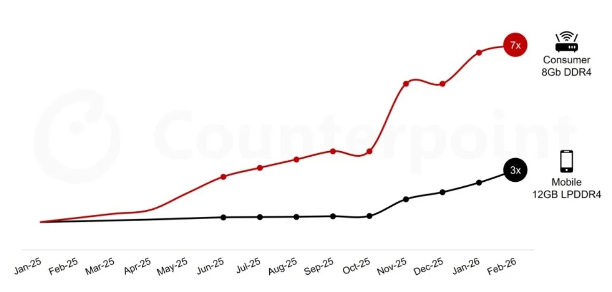 Według raportu Counterpoint Research "Memory Price Tracker" z lutego 2026 roku, napędzane rosnącym popytem ze strony producentów serwerów AI, ceny pamięci dla elektroniki użytkowej wzrosły o ponad 600 proc. w ciągu ostatniego roku. Przewiduje się, że ten wzrostowy trend utrzyma się co najmniej do czerwca 2026 r. Jednak chociaż ceny mogą osiągnąć szczyt w pierwszej połowie roku, to niedobory podaży prawdopodobnie utrzymają się również po tym okresie.