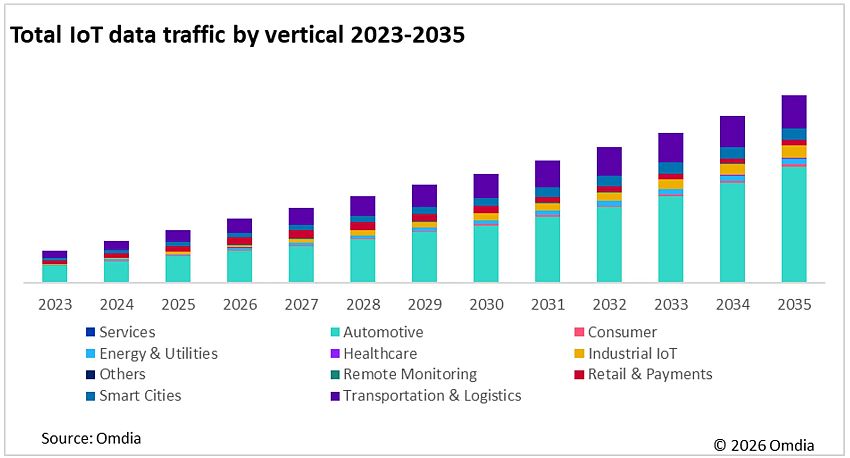 Globalny ruch danych generowany przez urządzenia cellular IoT wzrośnie do 218,6 eksabajtów do 2035 r., wynika z najnowszego raportu Omdia Cellular IoT Data Traffic From Cloud to Edge – 2026 Analysis. Głównym motorem wzrostu będzie przede wszystkim rosnące zapotrzebowanie na dane wykorzystywane do poprawy efektywności operacyjnej i tworzenia nowych źródeł przychodów oraz rosnące wykorzystanie usług opartych na wideo i łączności 5G.