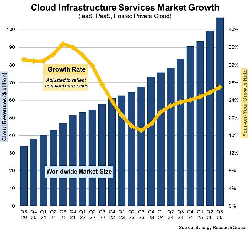 Analitycy Synergy szacują, że łączna wartość rynku infrastruktury chmurowej (IaaS, PaaS i hostowanej chmury prywatnej) w 3. kw. br. wyniosła 106,9 mld dol., a przychody z ostatnich 12 miesięcy sięgnęły 390 mld dol. Segment usług publicznych IaaS i PaaS stanowi zdecydowaną większość rynku i w minionym kwartale urósł o 30 proc. Trzej najwięksi dostawcy kontrolują łącznie 67 proc. rynku publicznej chmury.