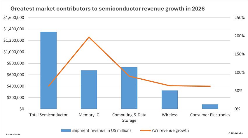 Analitycy Omdia znacząco podnieśli prognozę wzrostu globalnego rynku półprzewodników na 2026 r. – do 62,7 proc. Kluczowym czynnikiem pozostaje gwałtowny wzrost popytu na pamięci DRAM i NAND, napędzany rozwojem sztucznej inteligencji oraz utrzymującymi się niedoborami podaży.
