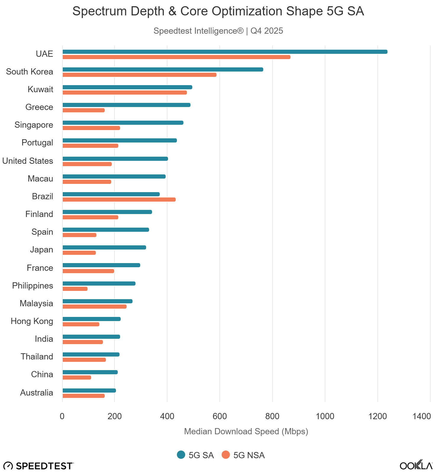 Dla porównania najszybsze na świecie prędkości pobierania danych w 5G SA, wynoszące średnio 1,13 Gb/s notują operatorzy w krajach Zatoki Perskiej, a to dzięki wdrożeniu technologii agregacji czterech nośnych, tj. połączeniu czterech oddzielnych bloków częstotliwości (nośnych) w jeden szerszy kanał przesyłowy i ulepszonego MIMO (Multiple-Input MultipleOutput). Przy czym szczytowe wartości przekraczają nawet 5 Gb/s, co pokazuje potencjał wydajnościowy w pełni zrealizowanej architektury 5G SA. Są to wartości wyższe o 193 proc. w porównaniu z sieciami 5G NSA w regionie.
