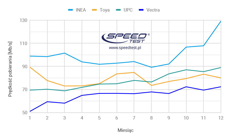 Drugie miejsce należy do łódzkiego operatora Toya z wynikiem 79,21 Mb/s. Podium zamyka UPC ze średnią prędkością pobierania danych 78,65 Mb/s. Tuż za podium znalazła się Vectra z wynikiem 65,45 Mb/s. Dodatkowo Inea i Vectra zostały wyróżnione przez SpeedTest.pl za największe wzrosty prędkości dostarczanej usługi dostępu do internetu w 2018 r. W przypadku Vectry wzrost ten jest również na poziomie 48 proc. w stosunku do średnich prędkości za rok 2017 (44,18 Mb/s).