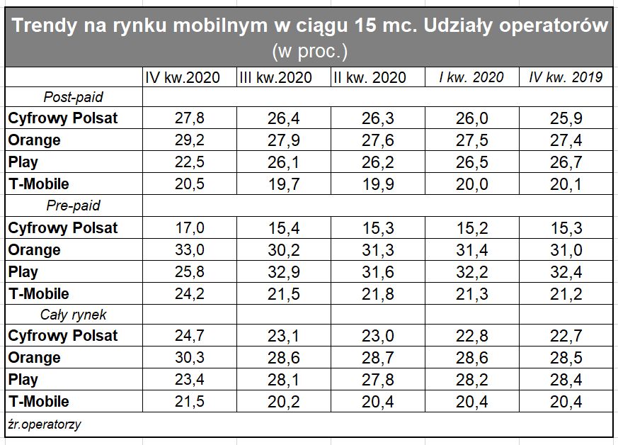 Jeżeli chodzi o pozostałych operatorów, to Cyfrowy Polsat kontynuuje swój rajd na rynku kontraktowym. IV kw. 2020 r. był dla niego najbardziej od trzech lat udanym okresem sprzedaży kart kontraktowych. Orange nadal pilnuje bezpiecznego dystansu do konkurenta w tym segmencie. T-Mobile kontynuuje strategię ostrożnej inwestycji w rynek kontraktowy i odważniejszej w rynek pre-paid, który akurat obaj główni konkurenci raczej pomijają.