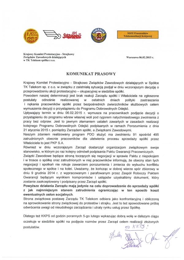 Związki zawodowe TK Telekom poinformowały o zakończonych w piątek po południu rozmowach z zarządem spółki. Chociaż zarząd wydał komunikat, w którym zapewnia, że nieskorzystanie z Programu Dobrowolnych Odejść w żadnym wypadku nie może w konsekwencji spowodować zwolnienia z pracy, to związkowcy zdają się nie dowierzać tym zapewnieniom. Niemniej głównym punktem sporu w TK Telekom jest podpisanie Programu Gwarancji Pracowniczych przed prywatyzacją spółki. Związkowcy domagają się takiego dokumentu, który ich zdaniem od kilku lat jest obiecywany przez właściciela. Grożą podjęciem nowej akcji protestacyjnej, jeżeli taki dokument nie zostanie uzgodniony i podpisany do 27 lutego. Rozpoczynają konsultacje referendum pracowniczego, którego celem jest zgoda na taką akcję protestacyjną, gdyby spółka miała zostać sprzedana bez podpisanego Programu Gwarancji Pracowniczych.