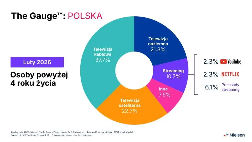Choć średni czas oglądania treści online nieznacznie spadł, streaming umocnił swoją pozycję pod względem zasięgu. Udział streamingu w całkowitej oglądalności na ekranach telewizorów osiągnął rekordowe 10,7 proc., wobec 10,5 proc. w styczniu br. Liderzy rynku – YouTube i Netflix – utrzymali swoje udziały na poziomie 2,3%. Jak podkreśla Nielsen, „segment streamingowy rośnie w siłę pod kątem zasięgu”.