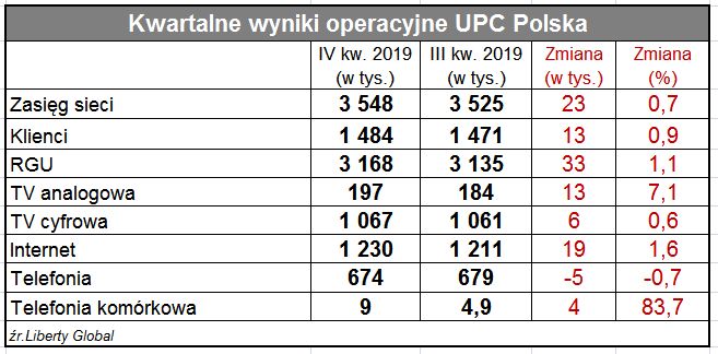 Grupa Liberty Global, właściciel sieci UPC Polska, opublikowała raport za 2019 r. Wynika z niego, że w ubiegłym roku polska sieć kablowa zdobyła 36 tys. nowych klientów, sprzedała 115 tys. nowych usług (RGU) i włączyła w zasięg swojej sieci 84 tys. nowych gospodarstw domowych. Do 2 mln gospodarstw w całym swoim zasięgu (co stanowi 66 proc. sieci) UPC dociera z gigabitowymi usługami.